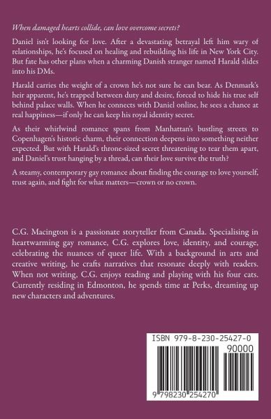 When damaged hearts collide, can love overcome secrets? Daniel isn't looking for love. After a devastating betrayal left him wary of relationships, he's focused on healing and rebuilding his life in New York City. But fate has other plans when a charming Danish stranger named Harald slides into his DMs. Harald carries the weight of a crown he's not sure he can bear. As Denmark's heir apparent, he's trapped between duty and desire, forced to hide his true self behind palace walls. When he connects with Daniel online, he sees a chance at real happiness-if only he can keep his royal identity secret. As their whirlwind romance spans from Manhattan's bustling streets to Copenhagen's historic charm, their connection deepens into something neither expected. But with Harald's throne-sized secret threatening to tear them apart, and Daniel's trust hanging by a thread, can their love survive the truth? A steamy, contemporary gay romance about finding the courage to love yourself, trust again, and fight for what matters-crown or no crown.