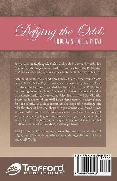 In the memoir Defying the Odds, Urduja Dela Cueva chronicles her fascinating life story, opening with her journey from the Philippines to America where she begins a new chapter with the love of her life. After meeting Ralph, a handsome Navy Officer, at the United States Naval Base in Subic Bay, Urduja made the agonizing choice to leave her three children and extended family behind in the Philippines and immigrate to the United States in 1969. After she marries Ralph in a simple wedding ceremony at City Hall in Norfolk, Virginia, Ralph lands a new job on Wall Street that promises a bright future for their family. As Urduja encounters challenge after challenge, she tells the story of how she obtained a permanent visa, found steady work, and took courses at New York University, all while experiencing frightening, foretelling nightmares every night while she slept. Urduja's true and fascinating story proves that one woman can defy all odds and still win in the end through the power of faith and God's word.