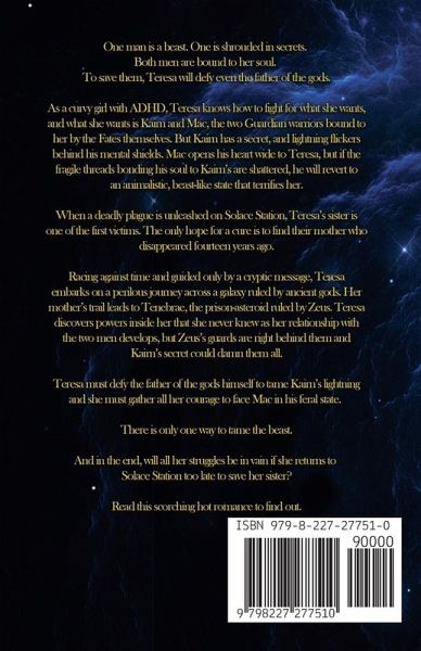 One man is a beast. One is shrouded in secrets. Both men are bound to her soul. To save them, Teresa will defy even the father of the gods. As a curvy girl with ADHD, Teresa knows how to fight for what she wants, and what she wants is Kairn and Mac, the two Guardian warriors bound to her by the Fates themselves. But Kairn has a secret, and lightning flickers behind his mental shields. Mac opens his heart wide to Teresa, but if the fragile threads bonding his soul to Kairn's are shattered, he will revert to an animalistic, beast-like state that terrifies her. When a deadly plague is unleashed on Solace Station, Teresa's sister is one of the first victims. The only hope for a cure is to find their mother who disappeared fourteen years ago. Racing against time and guided only by a cryptic message, Teresa embarks on a perilous journey across a galaxy ruled by ancient gods. Her mother's trail leads to Tenebrae, the prison-asteroid ruled by Zeus. Teresa discovers powers inside her that she never knew as her relationship with the two men develops, but Zeus's guards are right behind them and Kairn's secret could damn them all. Teresa must defy the father of the gods himself to tame Kairn's lightning and she must gather all her courage to face Mac in his feral state. There is only one way to tame the beast. And in the end, will all her struggles be in vain if she returns to Solace Station too late to save her sister? Read this scorching hot romance to find out.