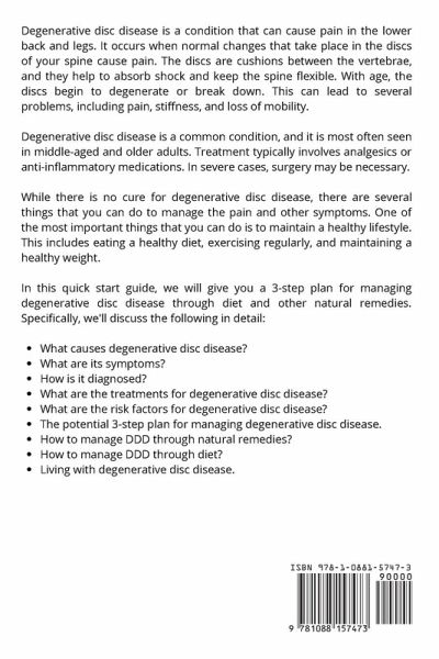 Degenerative disc disease is a condition that can cause pain in the lower back and legs. It occurs when normal changes that take place in the discs of your spine cause pain. The discs are cushions between the vertebrae, and they help to absorb shock and keep the spine flexible. With age, the discs begin to degenerate or break down. This can lead to several problems, including pain, stiffness, and loss of mobility. Degenerative disc disease is a common condition, and it is most often seen in middle-aged and older adults. Treatment typically involves analgesics or anti-inflammatory medications. In severe cases, surgery may be necessary. While there is no cure for degenerative disc disease, there are several things that you can do to manage the pain and other symptoms. One of the most important things that you can do is to maintain a healthy lifestyle. This includes eating a healthy diet, exercising regularly, and maintaining a healthy weight. In this quick start guide, we will give you a 3-step plan for managing degenerative disc disease through diet and other natural remedies. Specifically, we'll discuss the following in detail: ¿ What causes degenerative disc disease?¿ What are its symptoms?¿ How is it diagnosed?¿ What are the treatments for degenerative disc disease?¿ What are the risk factors for degenerative disc disease?¿ The potential 3-step plan for managing degenerative disc disease.¿ How to manage DDD through natural remedies?¿ How to manage DDD through diet?¿ Living with degenerative disc disease.