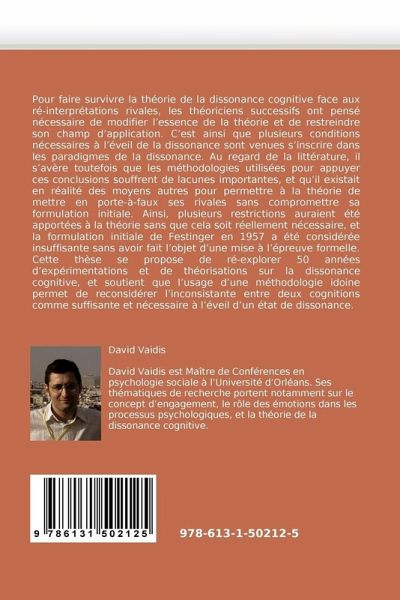 Pour faire survivre la théorie de la dissonance cognitive face aux ré-interprétations rivales, les théoriciens successifs ont pensé nécessaire de modifier l'essence de la théorie et de restreindre son champ d'application. C'est ainsi que plusieurs conditions nécessaires à l'éveil de la dissonance sont venues s'inscrire dans les paradigmes de la dissonance. Au regard de la littérature, il s'avère toutefois que les méthodologies utilisées pour appuyer ces conclusions souffrent de lacunes importantes, et qu'il existait en réalité des moyens autres pour permettre à la théorie de mettre en porte-à-faux ses rivales sans compromettre sa formulation initiale. Ainsi, plusieurs restrictions auraient été apportées à la théorie sans que cela soit réellement nécessaire, et la formulation initiale de Festinger en 1957 a été considérée insuffisante sans avoir fait l'objet d'une mise à l'épreuve formelle. Cette thèse se propose de ré-explorer 50 années d'expérimentations et de théorisations sur la dissonance cognitive, et soutient que l'usage d'une méthodologie idoine permet de reconsidérer l'inconsistante entre deux cognitions comme suffisante et nécessaire à l'éveil d'un état de dissonance.