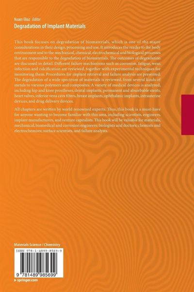 This book reviews the current understanding of the mechanical, chemical and biological processes that are responsible for the degradation of a variety of implant materials. All 18 chapters will be written by internationally renowned experts to address both fundamental and practical aspects of research into the field. Different failure mechanisms such as corrosion, fatigue, and wear will be reviewed, together with experimental techniques for monitoring them, either in vitro or in vivo. Procedures for implant retrieval and analysis will be presented. A variety of biomaterials (stainless steels, titanium and its alloys, nitinol, magnesium alloys, polyethylene, biodegradable polymers, silicone gel, hydrogels, calcium phosphates) and medical devices (orthopedic and dental implants, stents, heart valves, breast implants) will be analyzed in detail. The book will serve as a broad reference source for graduate students and researchers studying biomedicine, corrosion, surface science, andelectrochemistry.