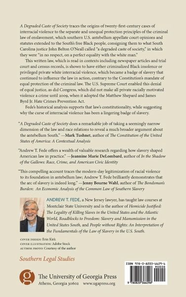 A Degraded Caste of Society traces the origins of twenty-first-century cases of interracial violence, such as the February 2020 murder of Ahmaud Arbery, to the separate and unequal protection principles of the criminal law of enslavement in the southern United States. These principles, which were extended by antebellum appellate court opinions and statutes to the South's free Black population, consigned free Black people to what South Carolina justice John Belton O'Neall called a "degraded caste of society." Under these statutes and court decisions, O'Neall contended that free Blacks were "in no respect, on a perfect equality with the white man." This positive written law privileged and legitimized private white interracial violence, which became a badge of slavery that influenced the law in action even after the Constitution mandated the enforcement of the equal protection of the criminal law. The U.S. Supreme Court enabled this denial of equal justice, as did Congress, which did not make all private white racially motivated violence a crime until 2009, when it adopted the Matthew Shepard and James Byrd Jr. Hate Crimes Prevention Act. Andrew T. Fede's historical analysis supports that law's constitutionality, while suggesting why--during the Jim Crow era and beyond--the promise of equal protection of the criminal law was not realized. First, this book analyzes the evolution of legal doctrines in statutes and appellate court decisions, combined with other historical evidence, including newspapers and trial court and census records, to create comprehensive contexts for a more complete understanding of the positive law sources examined. Second, Fede reveals the origins and development of the separate and unequal protection doctrine. Third, the book demonstrates why this legal history provides an essential context for an understanding of the continuing curse of interracial violence in the United States as a lingering and deadly badge of slavery, which Congress has the authority to criminalize under its Thirteenth Amendment enforcement power.