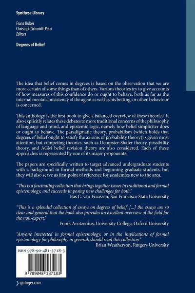 This anthology is the first book to give a balanced overview of these theories. It also explicitly relates these debates to more traditional concerns of the philosophy of language and mind, and epistemic logic, namely how belief simpliciter does or ought to behave. The paradigmatic theory, probabilism (which holds that degrees of belief ought to satisfy the axioms of probability theory) is given most attention, but competing theories, such as Dempster-Shafer theory, possibility theory, and AGM belief revision theory are also considered. Each of these approaches is represented by one of its major proponents.
