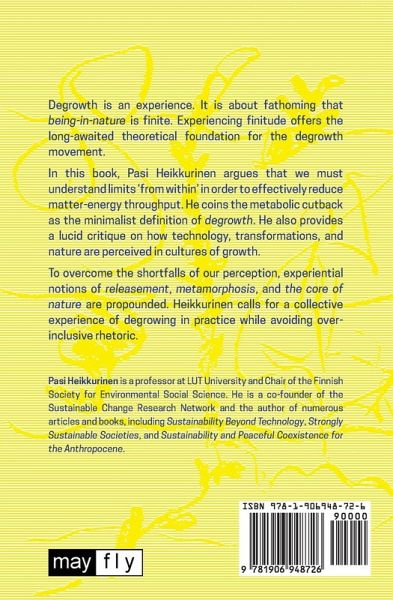 Degrowth is an experience. It is about fathoming that being-in-nature is finite. Experiencing finitude offers the long-awaited theoretical foundation for the degrowth movement. In this book, Pasi Heikkurinen argues that we must understand limits 'from within' in order to effectively reduce matter-energy throughput. He coins the metabolic cutback as the minimalist definition of degrowth. He also provides a lucid critique on how technology, transformations, and nature are perceived in cultures of growth. To overcome the shortfalls of our perception, experiential notions of releasement, metamorphosis, and the core of nature are propounded. Heikkurinen calls for a collective experience of degrowing in practice while avoiding over-inclusive rhetoric.