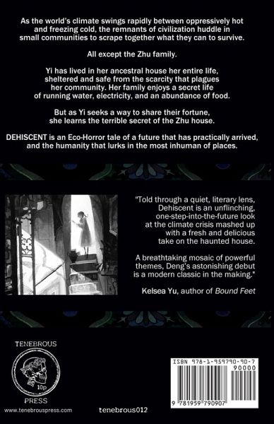 As the world's climate swings rapidly between oppressively hot and freezing cold, the remnants of civilization huddle in small communities to scrape together what they can to survive. All except the Zhu family. Yi has lived in her ancestral house her entire life, sheltered and safe from the scarcity that plagues her community. Her family enjoys a secret life of running water, electricity, and an abundance of food. But as Yi seeks a way to share their fortune, she learns the terrible secret of the Zhu house. DEHISCENT is an Eco-Horror tale of a future that has practically arrived, and the humanity that lurks in the most inhuman of places.