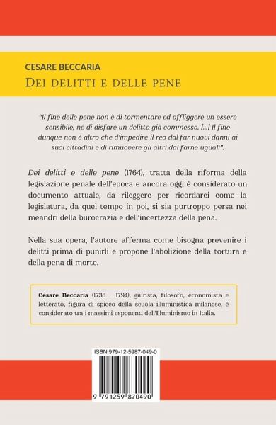 Dei delitti e delle pene (1764), tratta della riforma della legislazione penale dell'epoca e ancora oggi è considerato un documento attuale, da rileggere per ricordarci come la legislatura, da quel tempo in poi, si sia purtroppo persa nei meandri della burocrazia e dell'incertezza della pena. Nella sua opera, l'autore afferma come bisogna prevenire i delitti prima di punirli e propone l'abolizione della tortura e della pena di morte.