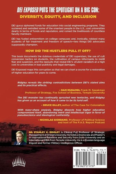 DEI Exposed puts the spotlight on a Big Con: Diversity, Equity, and Inclusion. DEI gurus siphoned funds for education into social engineering programs. They suckered and swindled some of the smartest people in the U.S., cost universities dearly in terms of funds and reputation, and ruined the livelihoods of countless faculty members. DEI has fueled antisemitism on college campuses and, ironically, robbed many students of fair treatment and freedom of speech-two things DEI advocates supposedly champion. How did the hustlers pull it off? This book documents the dubious credentials of DEI superstars, the use of cult conversion tactics on students, the cultivation of campus informants to instill fear and suspicion, and the lawsuits that reveal DEI's virulent racialism at a high cost to universities in bad publicity and legal damages. DEI Exposed maps this corruption so that we can chart a course for a restoration of higher education for years to come. Ridgley reveals the striking contradictions between DEI's stated aims and its practical effects. - Ram Mudambi, Frank M. Speakman Professor of Strategy, Fox School of Business, Temple University The DEI monster has continually sprouted new tentacles, and Ridgley has given us an account of how it came to be its lurid self. - Bruce Gilley, author of The Case for Colonialism With razor-sharp analysis, Ridgley dissects how higher education compromised itself, abandoning merit and intellectual vigor in favor of pseudoscience and ideological conformity. - Nicholas Giordano, Professor of Political Science and host of The P.A.S. Report Podcast Dr. Stanley K. Ridgley is Clinical Full Professor of Strategic Management at Drexel University. He holds a Doctorate and Master's in International Relations and Security from Duke University and an International MBA from Temple University. He is a Russian language linguist and former Military Intelligence Officer.