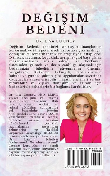 Kendinizi iyile¿tirmek, sevmek ve güçlendirmek için bedenimizi kullanmak Dr. Lisa Cooney taraf¿ndan kaleme al¿nan De¿i¿im Bedeni, insan¿ k¿s¿tlayan inançlardan kurtulmak ve tam potansiyele ulämak için dönü¿türücü bedensel teknikleri ele almaktad¿r. Kitap, inkâr etme, savunma, bälant¿y¿ kesme, kopma gibi bäa ç¿kma mekanizmalar¿n¿ incelemekte ve korkunun üstesinden gelmek ve radikal bir canl¿l¿k yaratmak için bedenin bilgeli¿ine güvenmeyi vurgulamaktad¿r. Roar® Tekni¿i, rahats¿zl¿klar¿ benimsemek ve günlük minnettarl¿k gibi al¿¿t¿rmalar sayesinde okuyucular iyile¿menin s¿rlar¿n¿ ke¿fedebilir, negatif enerjilerini üzerlerinden atabilir ve derin bir dönü¿üm ve güçlenme için bedenleriyle daha derin bir bä kurabilirler. Dr. Lisa Cooney, PhD, LMFT, Ruh Terapisi, Yäam Koçlüu ve Ruhsal Dönü¿üm üzerine odaklanan, ki¿isel dönü¿üm ve travma tedavisinde öncülük eden bir uzmand¿r. Ç¿¿¿r açan Live Your ROAR®'¿n yarat¿c¿s¿ olan Dr. Cooney, binlerce insan¿n hayat¿n¿ de¿i¿tirmi¿, çocukken yäad¿klar¿ istismar¿n üstesinden gelmelerine ve "Radically Orgasmically Alive Reality" (ROAR®)'a ulämalar¿na yard¿mc¿ olmütur. Dr. Lisa'n¿n çal¿¿malar¿ "Bäaracä¿m!... Ne Olursa Olsun!" felsefesine ve kendi seçimlerinizi yapma, büyümeye kendini adama, evrenle i¿ birli¿i yapma ve hayal etti¿iniz hayat¿ yaratma ilkelerine dayanmaktad¿r.