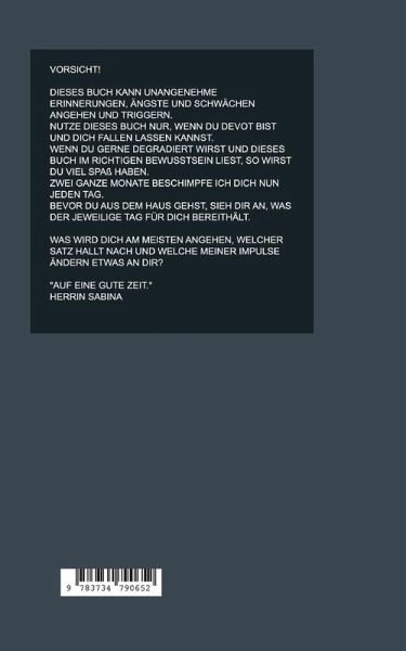 Vorsicht! Dieses Buch kann unangenehme Erinnerungen, Ängste und Schwächen angehen und triggern. Nutze dieses Buch nur, wenn Du devot bist und Dich fallen lassen kannst. Wenn Du gerne degradiert wirst und dieses Buch im richtigen Bewusstsein liest, so wirst Du viel Spaß haben. Zwei ganze Monate beschimpfe ich Dich nun jeden Tag. Bevor Du aus dem Haus gehst, sieh Dir an, was der jeweilige Tag für Dich bereithält. Was wird Dich am meisten angehen, welcher Satz hallt nach und welche meiner Impulse ändern etwas an Dir?Auf eine gute Zeit.Herrin Sabina