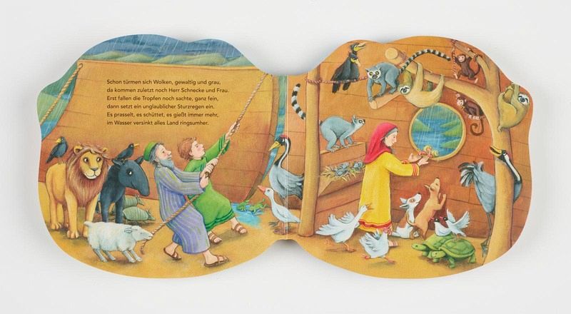 Die biblische Geschichte von Noah, der eine Arche für die Tiere baut. Das kleine Pappbilderbuch in Form der Arche Noah ist lebendig gereimt und liebevoll illustriert. Auf dem Cover gibt es ein Guckloch, durch das man in das Schiff hineinsehen kann. Für Kinder ab 18 Monaten geeignet.