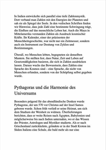 Entschlüssle den geheimen Code deines Lebens Dein Geburtsdatum ist kein Zufall - es ist der Schlüssel zu deinem wahren Selbst, zu jener verborgenen Melodie, nach der deine Seele seit deiner ersten Sekunde tanzt. Hast du dich jemals gefragt, warum dir bestimmte Menschen immer wieder begegnen? Warum sich manche Wege leicht öffnen - und andere wie von unsichtbarer Hand blockiert bleiben? Warum du in manchen Momenten spürst, dass das Leben dich ruft - und du trotzdem zögerst, den nächsten Schritt zu gehen? Die Antwort liegt verborgen in den Zahlen, die dich seit deiner Geburt begleiten. Sie sind wie stille Zeugen deiner Bestimmung - Symbole, die im Rhythmus des Universums schwingen und dir zeigen, wer du wirklich bist. In "Dein Lebenspfad - Der geheime Code der Zahlen und der Schlüssel zu deinem wahren Selbst" erfährst du, wie du mithilfe der uralten Numerologie die unsichtbaren Muster deines Lebens entschlüsselst. Du lernst, die Sprache der Zahlen zu verstehen - jene Sprache, in der das Leben mit dir spricht, wenn du bereit bist, zuzuhören. Dieses Buch führt dich sanft, aber kraftvoll durch die symbolische Welt der Zahlen. Es öffnet Türen zu verborgenen Ebenen deines Bewusstseins und zeigt dir, wie du ihre Botschaften nutzen kannst, um Klarheit, Sinn und Richtung zu finden - in Beziehungen, Entscheidungen und auf deinem ganz persönlichen Seelenweg. ¿ So findest du deinen Lebenspfad Dein Lebenspfad ist der Herzschlag deines numerologischen Codes - die Schwingung, die dich durch dein ganzes Leben begleitet. Um ihn zu berechnen, brauchst du nur dein Geburtsdatum. Schreibe es vollständig auf - zum Beispiel 25.07.1989 - und addiere alle Zahlen, bis du auf eine einstellige Zahl kommst: 2 + 5 + 0 + 7 + 1 + 9 + 8 + 9 = 41 ¿ 4 + 1 = 5 Dein Lebenspfad wäre in diesem Beispiel die 5. Manchmal ergibt die Summe 11, 22 oder 33 - das sind sogenannte Meisterzahlen, die eine besonders hohe spirituelle Schwingung tragen und nicht weiter reduziert werden. Jede Zahl ist eine Energie, ein Archetyp, ein Spiegel deiner Seele. Sie zeigt, welche Kräfte in dir wirken, welche Lektionen du lernst und welches Geschenk du der Welt bringst. ¿ Die Bedeutung der Lebenspfad-Zahlen 1 - Der Pionier Die Kraft des Anfangs. Mut, Eigenständigkeit, schöpferischer Wille. Hier beginnt der Weg der Selbstbestimmung. 2 - Der Verbinder Empathie, Harmonie, Diplomatie. Die Zwei lehrt, wie aus Gegensätzen Einheit wird. 3 - Der Ausdruck Kreativität, Lebensfreude, Kommunikation. Die Drei erinnert daran, dass Leichtigkeit eine Form von Heilung ist. 4 - Der Erbauer Struktur, Stabilität, Vertrauen in das Sichtbare. Die Vier erschafft Sicherheit durch klare Formen. 5 - Der Freigeist Veränderung, Abenteuer, Bewegung. Die Fünf fordert dich auf, Grenzen zu sprengen und Neues zu wagen. 6 - Der Hüter des Herzens Liebe, Verantwortung, Familie. Die Sechs heilt durch Fürsorge - wenn sie lernt, sich selbst nicht zu vergessen. 7 - Der Suchende Tiefe, Intuition, Erkenntnis. Die Sieben führt dich in die Stille, wo Wissen zu Weisheit wird. 8 - Der Gestalter Macht, Manifestation, Ausgleich. Die Acht lehrt, wie innere Stärke zur äußeren Fülle wird. 9 - Der Vollender Mitgefühl, Loslassen, universelle Liebe. Die Neun bringt Zyklen zum Abschluss und öffnet das Herz für das Ganze. 11, 22, 33 - Die Meisterzahlen Spirituelle Lehrer und Brückenbauer. Sie tragen das Potenzial, Licht in die Welt zu bringen - durch Bewusstsein, Inspiration und Dienst am Ganzen. Erkenne, warum bestimmte Herausforderungen immer wieder auftauchen - und was sie dir wirklich lehren wollen. Entdecke deine verborgenen Talente und Lebensaufgaben - das, was dich einzigartig macht. Finde zurück zu deiner inneren Stimme, zu jener stillen Kraft, die dich sicher führt, wenn du ihr vertraust. Spüre die Harmonie, die entsteht, wenn du endlich im Einklang mit deiner eigenen Schwingung lebst. Zahlen sind keine Zufälle - sie sind Botschaften deiner Seele, Wegweiser deines inneren Plans. Sie erzählen von dem, was du schon bist - und was du noch werden kannst. Dieses Buch hilft dir, diese Zeichen zu verstehen und ihre Weisheit in dein tägliches Leben zu bringen. ¿ Tauche ein in den Code deines Lebens. Finde Antworten, die dich verändern - klar, tief und berührend. Und erkenne, dass du nie zufällig hier bist.