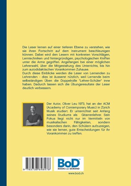 Die Leser lernen auf einer tieferen Ebene zu verstehen, wie sie ihren Fortschritt auf dem Instrument beschleunigen können. Dabei wird den Lesern mit konkreten Vorschlägen, Lerntechniken und hintergründigen, psychologischen Kniffen unter die Arme gegriffen. Angefangen bei einer möglichen Lehrerwahl, über die Mitgestaltung des Unterrichts, bis hin zum eigenständigen oder sogar autodidaktischen Vorankommen Zuhause.Durch diese Einblicke werden die Leser von Lernenden zu Lehrenden - dies ist äusserst nützlich, weil Lernende beim selbständigen Üben die Doppelrolle "Lehrer-Schüler" inne haben. Dadurch lassen sich die Übungsresultate der Leser deutlich verbessern.