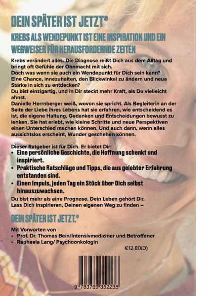 Ein Ratgeber für Krebspatienten, der selbst bei der Diagnose Bauchspeicheldrüsenkrebs Hoffnung vermittelt und eine persönliche Begleitung bei Krankheit bietet. Die Diagnose Krebs reißt Dich aus dem gewohnten Leben. Aber genau hier liegt auch die Möglichkeit für einen neuen Weg. In ihrem Ratgeber Dein Später ist Jetzt erzählt Danielle Herrnberger ihre bewegende Geschichte. Eine gelebte Reise voller Mut, Liebe und der Kraft des Perspektivwechsels. Gemeinsam mit der Liebe ihres Lebens hat sie einen heilsamen und komplementären Umgang mit dieser Diagnose gefunden. Sie zeigt, wie wichtig es ist, Eigenverantwortung zu übernehmen und zu erkennen, dass Du so viel mehr selbst in der Hand hast als Du denkst. Dieses Buch ist ein Mutmacher und bietet Inspiration für alle, die sich fragen, was sie jetzt tun können und wichtig ist. Danielle spricht aus Erfahrung und vermittelt in verständlicher und einfühlsamer Weise, wie Gedanken Dein Leben formen können. Mit herzlicher Empathie richtet sie sich an Betroffene, um ihnen Orientierung und Zuversicht zu schenken. Kein Entweder Oder, sondern komplementär. Ärzte bringen ihr Wissen, ihre Kunst und ihre Erfahrung ein, um Dich bestmöglich zu behandeln. Doch WIE Du diesen Weg meisterst, liegt in Deiner Hand. Es ist eine ganzheitliche Aufgabe, bei der Du die Hauptrolle spielst. Deine Gedanken, Deine Haltung und Deine Entscheidungen spielen eine entscheidende Rolle. Es geht nicht darum, das eine gegen das andere auszuspielen. Dieses Buch ist einzigartig. Eine authentische, gelebte Reise aus der Sicht einer Betroffenen erzählt, mit der Kraft der Liebe und einer positiven Haltung. Praktische Impulse mit konkrete Anleitungen, um die Eigenverantwortung zu stärken und aktiv zu werden. Inspirierende Begleiter wie ein Dankbarkeitstagebuch und Tagebuchseiten, die Deine Leistungen dokumentieren und Deinen Alltag bereichern. Schwierige Themen werden mit Herz und Tiefgang zu vermittelt. Die Einsichten, die sie durch ihre eigenen Erlebnisse gewonnen hat, finden in ihrem Ratgeber eine faszinierende Verbindung zu ihrem langjährigen Interesse an Psychologie, PsychoNeuroImmunologie und Gesundheitspsychologie. Diese wissenschaftlichen Perspektiven helfen nicht nur, die gemachten Erfahrungen besser zu verstehen, sondern untermauern und vertiefen das, was sie durch ihre gelebte Realität erfahren hat. Diese Verbindung aus Theorie und Praxis macht diesen Ratgeber zu einem einzigartigen Begleiter.