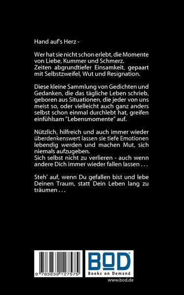 Hand auf's Herz -Wer hat sie nicht schon erlebt, die Momente von Liebe, Kummer und Schmerz. Zeiten abgrundtiefer Einsamkeit, gepaart mit Selbstzweifel, Wut und Resignation. Diese kleine Sammlung von Gedichten und Gedanken, die das tägliche Leben schrieb, geboren aus Situationen, die jeder von uns meist so, oder vielleicht auch ganz anders schon einmal selbst durchlebt hat greifen einfühlsam "Lebensmomente" auf.Nützlich, hilfreich und auch immer wieder überdenkenswert lassen sie tiefe Emotionen lebendig werden und machen Mut, sich niemals aufzugeben. Sich selbst nicht zu verlieren - auch wenn andere Dich immer wieder fallen lassen . . .Steh' auf, wenn Du gefallen bist und lebe Deinen Traum, statt Dein Leben lang zu träumen . . .