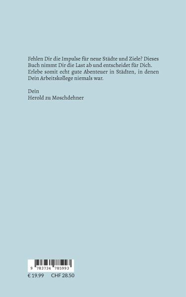 Fehlen Dir die Impulse für neue Städte und Ziele? Dieses Buch nimmt Dir die Last ab und entscheidet für Dich. Erlebe somit echt gute Abenteuer in Städten, in denen Dein Arbeitskollege niemals war. DeinHerold zu Moschdehner