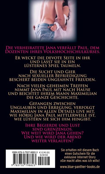 Die verheiratete Jana verfällt Paul, dem Dozenten ihres Volkshochschulkurses. Er weckt die devote Seite in ihr und lässt sie in ein lüsternes Spiel taumeln. Die Sucht und Gier nach sexueller Befriedigung beschert beiden ungeahnte Freuden.Nach vielen geheimen Treffen nimmt Jana Paul mit nach Hause und beichtet ihrem Mann Maximilian die ganze Geschichte.Gefangen zwischen Unglauben und Erregung, verfolgt Maximilian in allen Details live mit, wie hörig Jana Paul mittlerweile ist, wie lüstern sie sich ihm hingibt. Ihre Begierde und Lust sind grenzenlos.Wie weit wird Jana gehen?Und wie wird der Abend weiter verlaufen?Diese Ausgabe ist vollständig, unzensiert und enthält keine gekürzten erotischen Szenen.