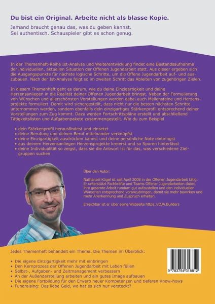 Diese Themenheft-Reihe hilft dir deine Arbeitssituation zu analysieren und direkt bestmöglich weiterzuentwickeln. Du erhältst Auswertungsbögen, Infografiken, Schritt-für-Schritt-Anleitungen und Checklisten. Jedes Themenheft behandelt ein Thema.In diesem Themenheft geht es darum, wie du dein Stärkenprofil herausfindest und einsetzt, deine Berufung und deinen Beruf miteinander verknüpfst, deine Einzigartigkeit ausdrücken kannst, Spuren hinterlässt, deine persönliche Note einbringst und deine Individualität so zeigst, dass sie die Antwort ist, für das, was verschiedene Zielgruppen suchen. Denn: Jemand benötigt genau das, was du - nur du - geben kannst.Du erhältst in diesem 60-seitigen Themenheft Tabellen zum Ausfüllen, Impulse, Schritt-für-Schritt-Anleitungen und Coaching- und Reflexionsfragen. Das Ziel ist es, dass du aus deinem Herzensanliegen deine Herzensprojekte kreierst und diese als Veranstaltung, Kleingruppen-Angebot, Ferienangebot etc. erfolgreich in die Welt deiner Offenen Jugendarbeit vor Ort bringst.