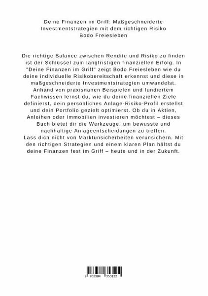 Die richtige Balance zwischen Rendite und Risiko zu finden ist der Schlüssel zum langfristigen finanziellen Erfolg. In "Deine Finanzen im Griff" zeigt Bodo Freiesleben, wie du deine individuelle Risikobereitschaft erkennst und diese in maßgeschneiderte Investmentstrategien umwandelst. Anhand von praxisnahen Beispielen und fundiertem Fachwissen lernst du, wie du deine finanziellen Ziele definierst, dein persönliches Anlage-Risiko-Profil erstellst und dein Portfolio gezielt optimierst. Ob du in Aktien, Anleihen oder Immobilien investieren möchtest - dieses Buch bietet dir die Werkzeuge, um bewusste und nachhaltige Anlageentscheidungen zu treffen. Lass dich nicht von Marktunsicherheiten verunsichern. Mit den richtigen Strategien und einem klaren Plan hältst du deine Finanzen fest im Griff - heute und in der Zukunft.