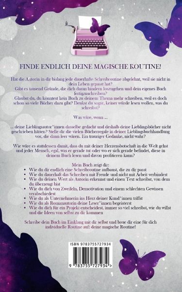Deine magische Routine richtet sich an Unternehmerinnen und an Romanautorinnen, also an Frauen, die endlich lernen wollen, jedes Buch, das sie zu schreiben anfangen, auch zu beenden. Es handelt sich um ein Werk, das sich besonders mit der praktischen Umsetzung des Schreibprozesses sowie mit dem Autorenmindset beschäftigt. Somit wird das übliche Handwerkszeug des Schreibens nicht explizit behandelt. Für eine bessere Anwendbarkeit der magischen Routine in konkreten Situationen werden Lösungen und Handlungsoptionen für vielfältige Herausforderungen im Alltag geliefert. Die Herausforderungen wurden von der Autorin aus einer Vielzahl von Gesprächen mit unveröffentlichten Autorinnen und eigenen Erfahrungen ausgewählt. Da dieses Buch umfassend hilft, eine individuelle und alltagstaugliche Schreibroutine zu kreieren, werden die Themen Selbstbewusstsein, Selbstliebe, Selbstfürsorge sowie der Umgang mit Kritik und Selbstkritik vor dem Hintergrund der Persönlichkeitsentwicklung behandelt. Deine magische Routine zeigt auf, wie von der Idee bis zur Veröffentlichungsreife vorgegangen werden kann, um das Verhältnis zum Schreiben dauerhaft zu heilen und es immer mit Spaß und mit Freude zu betreiben. Die Autorin gibt für Unternehmerinnen Hilfestellung, das Thema ihres Unternehmens für ein Buch zu bestimmen und weiterzuentwickeln. Daneben geht sie umfangreich auf die Bedürfnisse von Romanautorinnen ein. Das Herzstück ist, wie der Titel verrät, die magische Routine, auf der das gesamte Vorgehen aufbaut. Die Autorin hat diese im Rahmen der Entwicklung ihrer Coachingprogramme ausgearbeitet und erfolgreich vermittelt.Klappentext (Auszug):"Mein Buch zeigt dir:-Wie du dir endlich eine Schreibroutine aufbaust, die zu dir passt-Wie du dauerhaft das Schreiben mit Freude und nicht mit Arbeit verbindest-Wie du deinen Wert als Autorin erkennst und einen Text schreibst, von dem du überzeugt bist-Wie du dich von Zweifeln, Demotivation und einem schlechten Gewissen verabschiedest-Wie du als Unternehmerin ins Herz deiner Kund_innen triffst-Wie du als Romanautorin deine Leser_innen begeisterst-Wie du dich für ein Projekt entscheidest, immer so viel schreibst, wie du willst und die Ideen von selbst zu dir kommen"