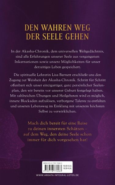 Entdecken Sie mithilfe der Akasha-Chronik Ihren ganz persönlichen, einzigartigen Seelenplan, der all unsere verborgenen Talente und karmischen Muster enthält! Die spirituelle Weisheitslehrerin Lisa Barnett eröffnet den Zugang zu den Seelenplänen, und sie zeigt, wie man unbewusste Traumata erkennt und heilt und was unsere Seele wachsen lässt. Weisheiten aus der Akasha-Chronik, zahlreiche Übungen und Heilgebete helfen dabei, unseren Lebensweg im Einklang mit unserem höchsten Selbst zu finden und zu verwirklichen. Machen Sie sich bereit für eine Reise zu Ihren innersten Schätzen - auf dem Weg, den Ihre Seele schon immer für Sie vorgesehen hat!
