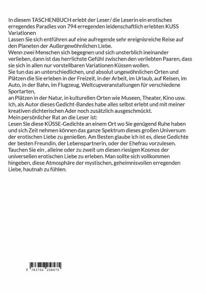 In diesem TASCHENBUCH erlebt der Leser/ die Leserin ein erotisches erregendes Paradies von 794 erregenden leidenschaftlich erlebten KUSS VariationenLassen Sie sich entführen auf eine aufregende sehr ereignisreiche Reise auf den Planeten der Außergewöhnlichen Liebe.Wenn zwei Menschen sich begegnen und sich unsterblich ineinander verlieben, dann ist das herrlichste Gefühl zwischen den verliebten Paaren, dass sie sich in allen nur vorstellbaren Variationen Küssen wollen.Sie tun das an unterschiedlichen, und absolut ungewöhnlichen Orten und Plätzen die Sie erleben in der Freizeit, in der Arbeit, im Urlaub, auf Reisen, im Auto, in der Bahn, im Flugzeug, Weltcupveranstaltungen für verschiedene Sportarten,an Plätzen in der Natur, in kulturellen Orten wie Museen, Theater, Kino usw. Ich, als Autor dieses Gedicht-Bandes habe alles selbst erlebt und mit meiner kreativen dichterischen Ader noch zusätzlich ausgeschmückt.Mein persönlicher Rat an die Leser ist:Lesen Sie diese KÜSSE-Gedichte an einem Ort wo Sie genügend Ruhe haben und sich Zeit nehmen können das ganze Spektrum dieses großen Universum der erotischen Liebe zu genießen. Am Besten glaube ich ist es, diese Gedichte der besten Freundin, der Lebenspartnerin, oder der Ehefrau vorzulesen.Tauchen Sie ein , alleine oder zu zweit um diesen riesigen Kosmos der universellen erotischen Liebe zu erleben. Man sollte sich vollkommen hingeben, diese Atmosphäre der mystischen, geheimnisvollen erregenden Liebe, hautnah zu fühlen.