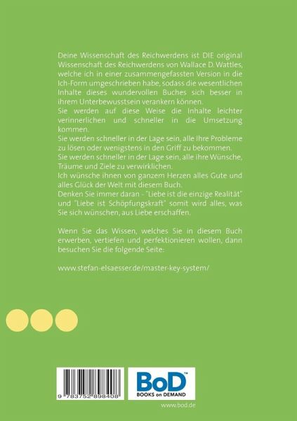 Deine Wissenschaft des Reichwerdens ist DIE original Wissenschaft des Reichwerdens von Wallace D. Wattles, welche ich in einer zusammengefassten Version in die Ich-Form umgeschrieben habe, sodass die wesentlichen Inhalte dieses wundervollen Buches sich besser in ihrem Unterbewusstsein verankern können.Sie werden auf diese Weise die Inhalte leichter verinnerlichen und schneller in die Umsetzung kommen.Sie werden schneller in der Lage sein, alle Ihre Probleme zu lösen oder wenigstens in den Griff zu bekommen.Sie werden schneller in der Lage sein, alle ihre Wünsche, Träume und Ziele zu verwirklichen.Ich wünsche ihnen von ganzem Herzen alles Gute und alles Glück der Welt mit diesem Buch.Denken Sie immer daran - "Liebe ist die einzige Realität" und "Liebe ist Schöpfungskraft" somit wird alles, was Sie sich wünschen, aus Liebe erschaffen.Wenn Sie das Wissen, welches Sie in diesem Buch erwerben, vertiefen und perfektionieren wollen, dann besuchen Sie die folgende Seite:www.stefan-elsaesser.de/master-key-system