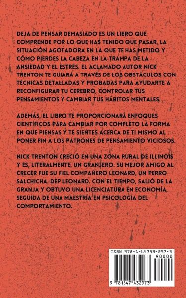 Supera los patrones de pensamiento negativos, reduce el estrés y vive una vida sin preocupaciones. Pensar demasiado es la mayor causa de infelicidad. No te quedes atrapado en un bucle de pensamientos sin fin. Vive el presente y deja de pensar en las cosas que no son importantes y que nunca lo serán. Libérate de tu prisión mental autoimpuesta. Deja deja de pensar demasiado es un libro que comprende por lo que has tenido que pasar, la situación agotadora en la que te has metido y cómo pierdes la cabeza en la trampa de la ansiedad y el estrés. El aclamado autor Nick Trenton te guiará a través de los obstáculos con técnicas detalladas y probadas para ayudarte a reconfigurar tu cerebro, controlar tus pensamientos y cambiar tus hábitos mentales. Además, el libro te proporcionará enfoques científicos para cambiar por completo la forma en que piensas y te sientes acerca de ti mismo al poner fin a los patrones de pensamiento viciosos. Deja de agonizar por el pasado e intenta predecir el futuro. Nick Trenton creció en una zona rural de Illinois y es, literalmente, un granjero. Su mejor amigo al crecer fue su fiel compañero Leonard, un perro salchicha. DEP Leonard. Con el tiempo, salió de la granja y obtuvo una licenciatura en economía, seguida de una maestría en psicología del comportamiento. Formas poderosas de dejar de rumiar y pensar en pensamientos negativos. -Cómo ser consciente de los desencadenantes espirales negativos. -Identificar y reconocer tus ansiedades internas. -Cómo mantener el enfoque en la relajación y la acción. -Métodos probados para superar los ataques de estrés. -Aprende a despejar tu mente y a concentrarte. Libera tu potencial ilimitado y comienza a vivir. Se acabó la autocrítica. Se acabaron las noches sin dormir por estar dando vueltas a la cabeza a las cosas. Libera tu mente de pensar demasiado y logra más, siéntete mejor y libera tu potencial. Por fin podrás vivir en el presente.