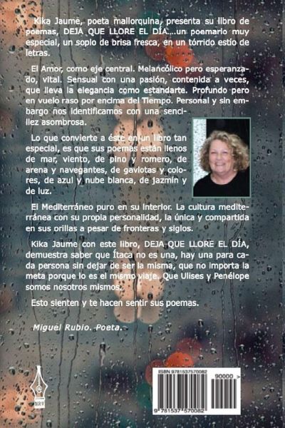 Poemas que lleva el mar Mediterráneo muy adentro del alma y cuya autora es un ventanal abierto que mira siempre a la mar con ojos de múltiples colores. "Deja que llore el día", título que nos adentra con una extraordinaria melancolía en el mágico mundo de las metáforas con un aliento poético de inconfundible Aire Mediterráneo. Es fácil encontrar puntos en común con la poeta, entre su retórica de realidades y sus quiméricas inspiraciones. Sus poemas cuentan historias que pueden mirarse con los ojos del corazón y tocarse con las manos del alma.