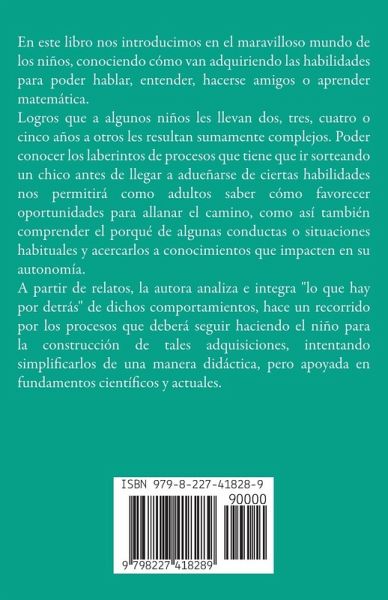 En este libro nos introducimos en el maravilloso mundo de los niños, conociendo cómo van adquiriendo las habilidades para poder hablar, entender, hacerse amigos o aprender matemática. Logros que a algunos niños les llevan dos, tres, cuatro o cinco años a otros les resultan sumamente complejos. Poder conocer los laberintos de procesos que tiene que ir sorteando un chico antes de llegar a adueñarse de ciertas habilidades nos permitirá como adultos saber cómo favorecer oportunidades para allanar el camino, como así también comprender el porqué de algunas conductas o situaciones habituales y acercarlos a conocimientos que impacten en su autonomía. A partir de relatos, la autora analiza e integra "lo que hay por detrás" de dichos comportamientos, hace un recorrido por los procesos que deberá seguir haciendo el niño para la construcción de tales adquisiciones, intentando simplificarlos de una manera didáctica, pero apoyada en fundamentos científicos y actuales.