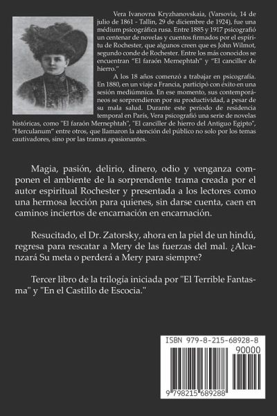 Magia, pasión, delirio, dinero, odio y venganza componen el ambiente de la sorprendente trama creada por el autor espiritual Rochester y presentada a los lectores como una hermosa lección para quienes, sin darse cuenta, caen en caminos inciertos de encarnación en encarnación. Resucitado, el Dr. Zatorsky, ahora en la piel de un hindú, regresa para rescatar a Mery de las fuerzas del mal. ¿Alcanzará Su meta o perderá a Mery para siempre? Tercer libro de la trilogía iniciada por "El Terrible Fantasma" y "En el Castillo de Escocia.".