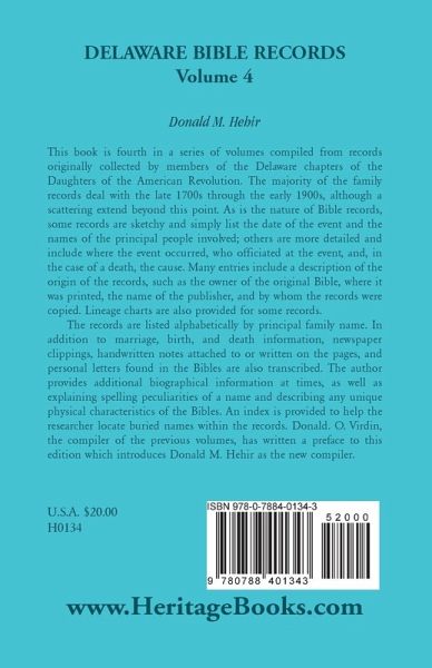 This book is fourth in a series of volumes compiled from records originally collected by members of the Delaware chapters of the Daughters of the American Revolution. The majority of the family records deal with the late 1700s through the early 1900s, although a scattering extend beyond this point. As is the nature of Bible records, some records are sketchy and simply list the date of the event and the names of the principal people involved; others are more detailed and include where the event occurred, who officiated at the event, and, in the case of a death, the cause. Many entries include a description of the origin of the records, such as the owner of the original Bible, where it was printed, the name of the publisher, and by whom the records were copied. Lineage charts are also provided for some records. The records are listed alphabetically by principal family name. In addition to marriage, birth, and death information, newspaper clippings, handwritten notes attached to or written on the pages, and personal letters found in the Bibles are also transcribed. The author provides additional biographical information at times, as well as explaining spelling peculiarities of a name and describing any unique physical characteristics of the Bibles. An index is provided to help the researcher locate buried names within the records. Donald. O. Virdin, the compiler of the previous volumes, has written a preface to this edition which introduces Donald M. Hehir as the new compiler.