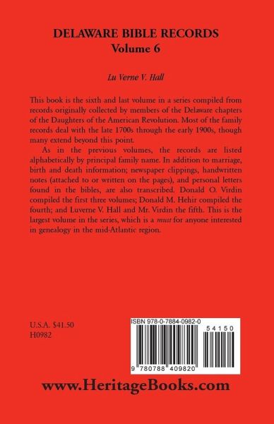 This book is the sixth and last volume in a series compiled from records originally collected by members of the Delaware chapters of the Daughters of the American Revolution. Most of the family records deal with the late 1700s through the early 1900s, though many extend beyond this point. As in the previous volumes, the records are listed alphabetically by principal family name. In addition to marriage, birth and death information; newspaper clippings, handwritten notes (attached to or written on the pages), and personal letters found in the bibles, are also transcribed. Donald O. Virdin compiled the first three volumes; Donald M. Hehir compiled the fourth; and Luverne V. Hall and Mr. Virdin the fifth. This is the largest volume in the series, which is a must for anyone interested in genealogy in the mid-Atlantic region.