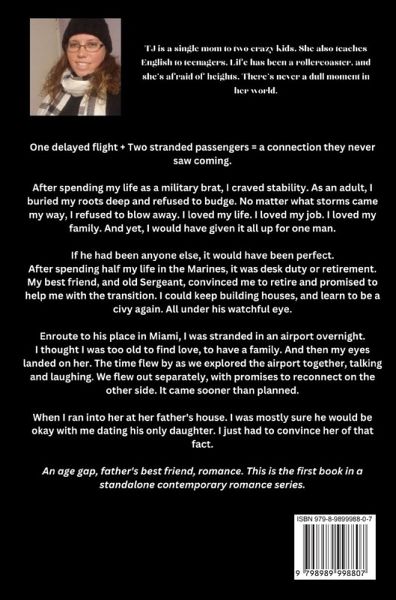 One delayed flight + Two stranded passengers = a connection they never saw coming. After spending my life as a military brat, I craved stability. As an adult, I buried my roots deep and refused to budge. No matter what storms came my way, I refused to blow away. I loved my life. I loved my job. I loved my family. And yet, I would have given it all up for one man. If he had been anyone else, it would have been perfect. After spending half my life in the Marines, it was desk duty or retirement. My best friend, and old Sergeant, convinced me to retire and promised to help me with the transition. I could keep building houses, and learn to be a civy again. All under his watchful eye. Enroute to his place in Miami, I was stranded in an airport overnight. I thought I was too old to find love, to have a family. And then my eyes landed on her. The time flew by as we explored the airport together, talking and laughing. We flew out separately, with promises to reconnect on the other side. It came sooner than planned. When I ran into her at her father's house. I was mostly sure he would be okay with me dating his only daughter. I just had to convince her of that fact. An age gap, father's best friend, romance. This is the first book in a standalone contemporary romance series.