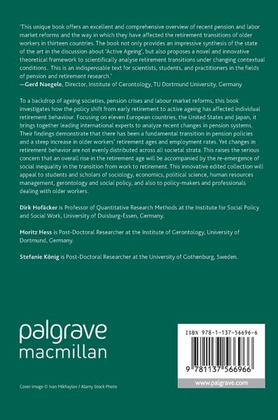 Chapter 1. Retirement Transitions in Times of Institutional Change - Theoretical Concept; Dirk Hofäcker and Jonas Radl.- Chapter 2. Trends and Determinants of Retirement Transition in Europe, the United States and Japan: A Comparative Overview; Stefanie König, Moritz Hess, and Dirk Hofäcker.- Chapter 3. Determinants of retirement and late career in Estonia; Marge Unt and Ellu Saar.- Chapter 4. Path dependency versus new determinants of retirement in the Czech Republic; Lucie Vidovicová.- Chapter 5. Retirement in a context of strong institutional uncertainty and territorial diversities: The case of Italy; Sonia Bertolini, Nicola De Luigi, Barbara Giullari, Valentina Goglio, Roberto Rizza, and Federica Santangelo.- Chapter 6. Flow and ebb of early retirement: Pension reform and labor market participation of older workers in Spain; Elisa Chuliá, Luis Garrido, and Jonas Radl.- Chapter 7. Germany: A Successful Reversal of Early Retirement?; Moritz Hess.- Chapter 8. From early exitto postponing pension: How the Dutch polder model shapes retirement; Maria Fleischmann and Ferry Koster.- Chapter 9. Retirement determinants in Austria: An aging society but a hesitant policymaker; Lisa Schmidthuber, Heike Schröder, and Edmund Panzenböck.- Chapter 10. Employment and retirement of older workers in the UK; Matt Flynn and Yuxin Li.- Chapter 11. Japan: Determinants of retirement in a hyper-aged society; Masa Higo, Heike Schröder and Atsuhiro Yamada.- Chapter 12. The gendered and liberal retirement regime in Switzerland; Ignacio Madero-Cabib.- Chapter 13. The outdistanced vanguard: Early retirement policy in Denmark as an obstacle to progress in active aging; Stefanie König and Julia Schilling.- Chapter 14. Sweden: Steeply rising older workers' employment rates in a late-exit country; Stefanie König and Gabriella Sjögren Lindquist.- Chapter 15. Increasing Heterogeneity of Retirement in the United States: Interactions Between State, Firm, and Individual Determinants of Later-Life Labor Force Withdrawal; David F. Warner.- Chapter 16. Retirement Transitions under Changing Institutional Conditions: Towards Increasing Inequalities? Comparing evidence from 13 countries; Moritz Hess, Stefanie König, and Dirk Hofäcker.