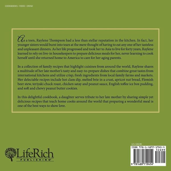 As a teen, Raylene Thompson had a less than stellar reputation in the kitchen. In fact, her younger sisters would burst into tears at the mere thought of having to eat any one of her tasteless and unpleasant dinners. As her life progressed and took her to Asia to live for forty years, Raylene learned to rely on live-in housekeepers to prepare delicious meals for her, never learning to cook herself until she returned home to America to care for her aging parents. In a collection of family recipes that highlight cuisines from around the world, Raylene shares a multitude of her late mother's tasty and easy-to-prepare dishes that combine great tastes from international kitchens and utilize crisp, fresh ingredients from local family farms and markets. Her delectable recipes include hot clam dip, melted brie in a crust, apricot nut bread, Flemish beer stew, teriyaki chuck roast, chicken satay and peanut sauce, English toffee ice box pudding, and soft and chewy peanut butter cookies. In this delightful cookbook, a daughter serves tribute to her late mother by sharing simple yet delicious recipes that teach home cooks around the world that preparing a wonderful meal is one of the best ways to show love.