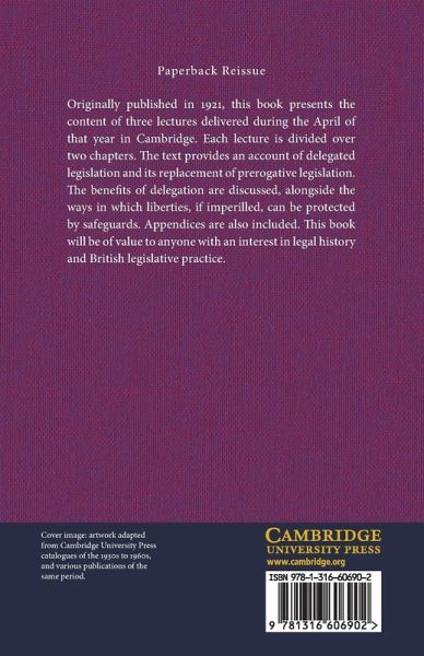 Originally published in 1921, this book presents the content of three lectures delivered during the April of that year in Cambridge. Each lecture is divided over two chapters. The text provides an account of delegated legislation and its replacement of prerogative legislation. The benefits of delegation are discussed, alongside the ways in which liberties, if imperilled, can be protected by safeguards. Appendices are also included. This book will be of value to anyone with an interest in legal history and British legislative practice.