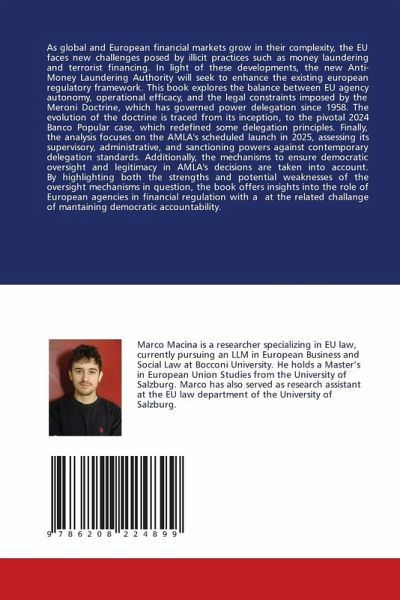 As global and European financial markets grow in their complexity, the EU faces new challenges posed by illicit practices such as money laundering and terrorist financing. In light of these developments, the new Anti-Money Laundering Authority will seek to enhance the existing european regulatory framework. This book explores the balance between EU agency autonomy, operational efficacy, and the legal constraints imposed by the Meroni Doctrine, which has governed power delegation since 1958. The evolution of the doctrine is traced from its inception, to the pivotal 2024 Banco Popular case, which redefined some delegation principles. Finally, the analysis focuses on the AMLA's scheduled launch in 2025, assessing its supervisory, administrative, and sanctioning powers against contemporary delegation standards. Additionally, the mechanisms to ensure democratic oversight and legitimacy in AMLA's decisions are taken into account. By highlighting both the strengths and potential weaknesses of the oversight mechanisms in question, the book offers insights into the role of European agencies in financial regulation with a at the related challange of mantaining democratic accountability.