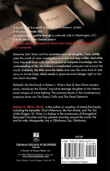 "Deleted!" features a walk through the world of computer crimes and international intrigue. In Amman, Jordan, a young Arab has broken the code designed to protect movie disks, which would cost the Motion Picture Association of America millions of dollars. The Sloans and their inquisitive seventeen-year-old daughter, Cara, journey through a maze of cyber-investigation to find the thief. Unexpectedly, Sam encounters a lead through the FBI that exposes him, the Sloan family, and his Middle Eastern partner to personal danger. Suddenly, the criminal's assault careens toward a most unexpected target!