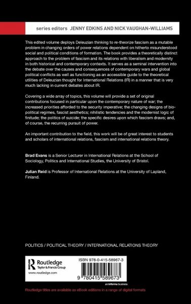 This edited volume deploys Deleuzian thinking to re-theorize fascism as a mutable problem in changing orders of power relations dependent on hitherto misunderstood social and political conditions of formation. The book provides a theoretically distinct approach to the problem of fascism and its relations with liberalism and modernity in both historical and contemporary contexts. It serves as a seminal intervention into the debate over the causes and consequences of contemporary wars and global political conflicts as well as functioning as an accessible guide to the theoretical utilities of Deleuzian thought for International Relations (IR) in a manner that is very much lacking in current debates about IR. Covering a wide array of topics, this volume will provide a set of original contributions focussed in particular upon the contemporary nature of war; the increased priorities afforded to the security imperative; the changing designs of bio-political regimes, fascist aesthetics; nihilistic tendencies and the modernist logic of finitude; the politics of suicide; the specific desires upon which fascism draws and, of course, the recurring pursuit of power. An important contribution to the field, this work will be of great interest to students and scholars of international relations, fascism and international relations theory.