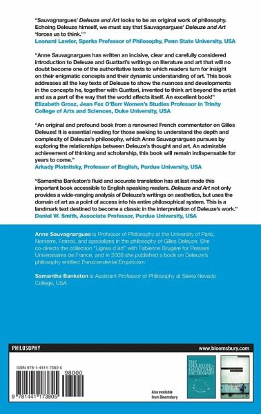 In Deleuze and Art Anne Sauvagnargues, one of the world's most renowned Deleuze scholars, offers a unique insight into the constitutive role played by art in the formation of Deleuze's thought. By reproducing Deleuze's social and intellectual references, Sauvagnargues is able to construct a precise map of the totality of Deleuze's work, pinpointing where key Deleuzian concepts first emerge and eventually disappear. This innovative methodology, which Sauvagnargues calls "periodization", provides a systematic historiography of Deleuze's philosophy that remains faithful to his affirmation of the principle of exteriority. By analyzing the external relations between Deleuze's self-proclaimed three philosophical periods, Sauvagnargues gives the reader an inside look into the conceptual and artistic landscape that surrounded Deleuze and the creation of his philosophy. With extreme clarity and precision, Sauvagnargues provides an important glimpse into Deleuze's philosophy by reconstructing the social and intellectual contexts that contributed to the trajectory of his thought. This book is the product of insightful and careful research, which has not been made available to English readers of Deleuze before now.