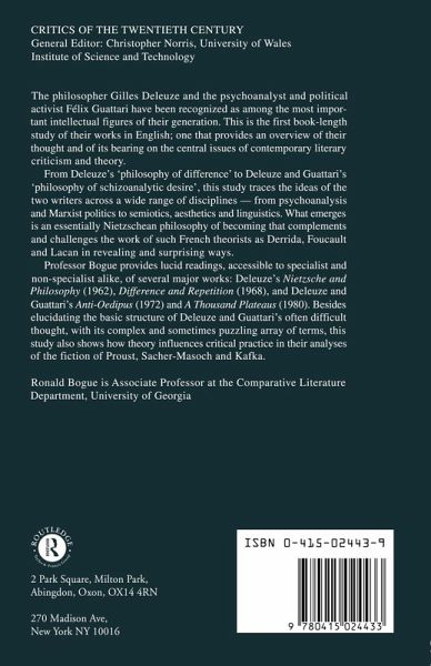 Deleuze and Guattari are two of the most important intellectual figures of their generation. In this first book-length study of their work in English, Ronald Bogue provides lucid readings of several of their major works.