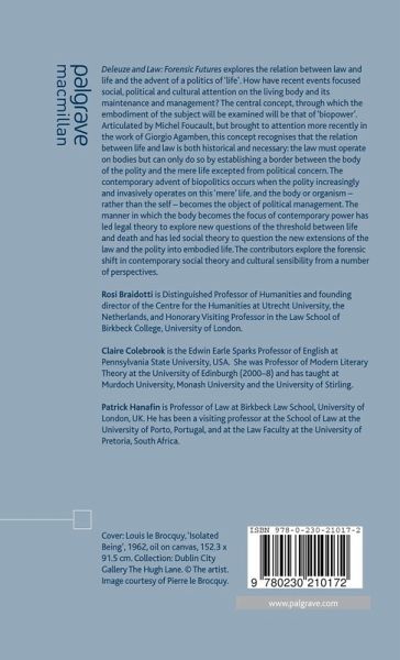Acknowledgements Notes on Contributors Introduction: Law and Deleuze: Forensic Futures; R.Braidotti , C.Colebrook & P.Hanafin Legal Theory After Deleuze; C.Colebrook The Time of Law: Evolution in Holmes and Bergson; A.Lefebvre Rights of Passage: Law and the Biopolitics of Dying; P.Hanafin The Terri Schiavo Case: Biopolitics, Biopower, and Privacy as Singularity; J.Protevi Vitalistic Feminethics: Materiality, Mediation and the End of Necrophilosophy; P.Maccormack Locating Deleuze's Eco-Philosophy: Between Bio/Zoe Power and Necro-Politics; R.Braidotti Is There Life in Cybernetics? Designing a Post-Humanist Bioethics; J.Zylinska The Silent Scream - Agamben, Deleuze and the Politics of the Unborn; M.Cooper Points of Departure: The Culture of US Airport Screening; L.Parks The Spectacle of War: Security, Legitimacy, and Profit Post-9/11; I.Buchanan & L.Guillaume Index