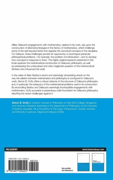 Gilles Deleuze's engagements with mathematics, replete in his work, rely upon the construction of alternative lineages in the history of mathematics, which challenge some of the self imposed limits that regulate the canonical concepts of the discipline. For Deleuze, these challenges provide an opportunity to reconfigure particular philosophical problems - for example, the problem of individuation - and to develop new concepts in response to them. The highly original research presented in this book explores the mathematical construction of Deleuze's philosophy, as well as addressing the undervalued and often neglected question of the mathematical thinkers who influenced his work. In the wake of Alain Badiou's recent and seemingly devastating attack on the way the relation between mathematics and philosophy is configured in Deleuze's work, Simon B.Duffy offers a robust defence of the structure of Deleuze's philosophy and, in particular, the adequacy of the mathematical problems used in its construction. By reconciling Badiou and Deleuze's seemingly incompatible engagements with mathematics, Duffy succeeds in presenting a solid foundation for Deleuze's philosophy, rebuffing the recent challenges against it.