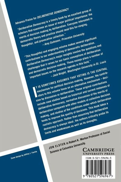 List of contributors Preface and acknowledgement Introduction Jon Elster 1. 'Claro!': an essay on discursive machismo Diego Gambetta 2. Deliberation as discussion James D. Fearon 3. All men are liars: is democracy meaningless? Gerrie Mackie 4. Deliberation and constitution making Jon Elster 5. Pathologies of deliberation Susan C. Stokes 6. Deliberation and ideological domination Adam Przeworski 7. Arguing for deliberation: some skeptical considerations James Johnson 8. Democracy and liberty Joshua Cohen 9. Health-health trade-offs Cass R. Sunstein 10. Full representation, deliberation and impartiality Roberto Gargarella Index.
