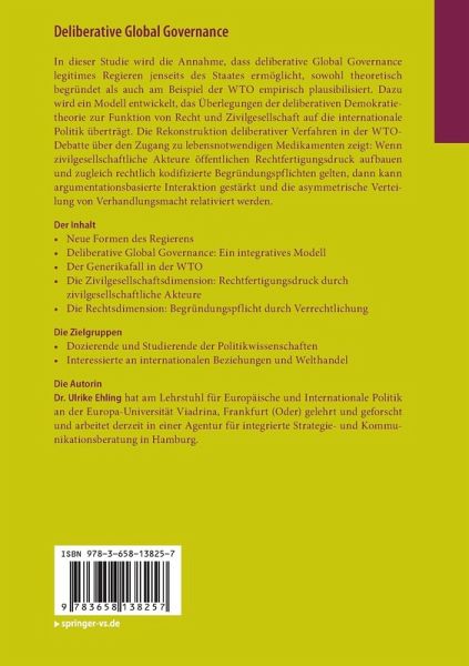 In dieser Studie wird dieAnnahme, dass deliberative Global Governance legitimes Regieren jenseits desStaates ermöglicht, sowohl theoretisch begründet als auch am Beispiel der WTOempirisch plausibilisiert. Dazu wird ein Modell entwickelt, das Überlegungender deliberativen Demokratietheorie zur Funktion von Recht und Zivilgesellschaftauf die internationale Politik überträgt. Die Rekonstruktion deliberativerVerfahren in der WTO-Debatte über den Zugang zu lebensnotwendigen Medikamentenzeigt: Wenn zivilgesellschaftliche Akteure öffentlichen Rechtfertigungsdruck aufbauen und zugleich rechtlichkodifizierte Begründungspflichten gelten, dann kann argumentationsbasierteInteraktion gestärkt und die asymmetrische Verteilung von Verhandlungsmachtrelativiert werden.