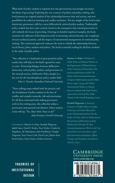 What kind of policy analysis is required now that governments increasingly encounter the limits of governing? Exploring the contexts of politics and policy making, this 2003 book presents an original analysis of the relationship between state and society, and new possibilities for collective learning and conflict resolution. The key insight of the book is that democratic governance calls for a new deliberatively-oriented policy analysis. Traditionally policy analysis has been state-centered, based on the assumption that central government is self-evidently the locus of governing. Drawing on detailed empirical examples, the book examines the influence of developments such as increasing ethnic and cultural diversity, the complexity of socio-technical systems, and the impact of transnational arrangements on national policy making. This contextual approach indicates the need to rethink the relationship between social theory, policy analysis, and politics. The book is essential reading for all those involved in the study of public policy.