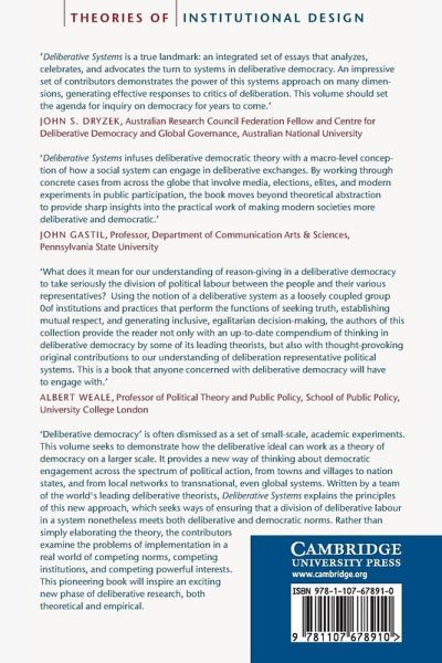 1. A systemic approach to deliberative democracy Jane Mansbridge, James Bohman, Simone Chambers, Thomas Christiano, Archon Fung, John Parkinson, Dennis F. Thompson and Mark E. Warren; 2. Rational deliberation among experts and citizens Thomas Christiano; 3. Deliberation and mass democracy Simone Chambers; 4. Representation in the deliberative system James Bohman; 5. Two trust-based uses of minipublics in democratic systems Michael K. MacKenzie and Mark E. Warren; 6. On the embeddedness of deliberative systems: why elitist innovations matter more Yannis Papadopoulos; 7. Democratizing deliberative systems John Parkinson.