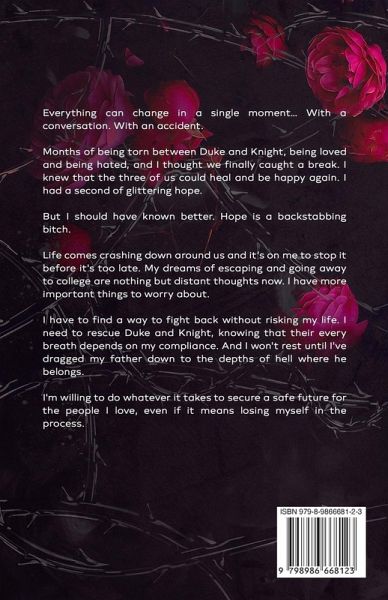 Everything can change in a single moment... With a conversation. With an accident. Months of being torn between Duke and Knight, being loved and being hated, and I thought we finally caught a break. I knew that the three of us together could heal and be happy again. I had a second of glittering hope. But I should have known better. Hope is a backstabbing bitch. Life comes crashing down around us and it's on me to stop it. My dreams of escaping and going away to college are nothing but distant thoughts now. I have more important things to worry about. How to fight back without risking my life. How to save Duke and Knight when every breath they take is relying on me falling in line. How to drag my father down to hell where he belongs. I'll do whatever it takes to secure a safe future for everyone I love. Even if I don't recognize myself when this is all over. *Part two of a duet. Must be read in order. This is a MFM, stepbrother romance with mature themes that may be difficult for some readers. Please check full trigger warning page before deciding if this book is right for you.*