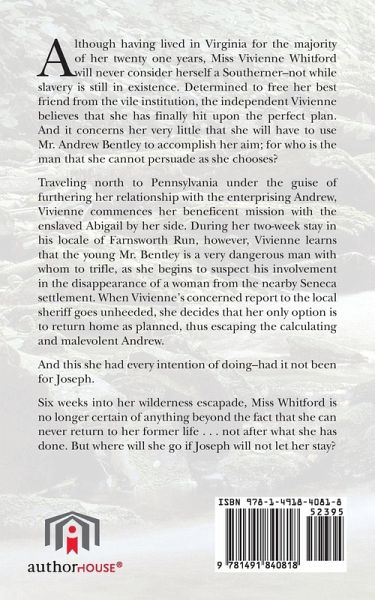 Although having lived in Virginia for the majority of her twenty one years, Miss Vivienne Whitford will never consider herself a Southerner-not while slavery is still in existence. Determined to free her best friend from the vile institution, the independent Vivienne believes that she has finally hit upon the perfect plan. And it concerns her very little that she will have to use Mr. Andrew Bentley to accomplish her aim; for who is the man that she cannot persuade as she chooses? Traveling north to Pennsylvania under the guise of furthering her relationship with the enterprising Andrew, Vivienne commences her beneficent mission with the enslaved Abigail by her side. During her two-week stay in his locale of Farnsworth Run, however, Vivienne learns that the young Mr. Bentley is a very dangerous man with whom to trifle, as she begins to suspect his involvement in the disappearance of a woman from the nearby Seneca settlement. When Vivienne's concerned report to the local sheriff goes unheeded, she decides that her only option is to return home as planned, thus escaping the calculating and malevolent Andrew. And this she had every intention of doing-had it not been for Joseph. Six weeks into her wilderness escapade, Miss Whitford is no longer certain of anything beyond the fact that she can never return to her former life . . . not after what she has done. But where will she go if Joseph will not let her stay?